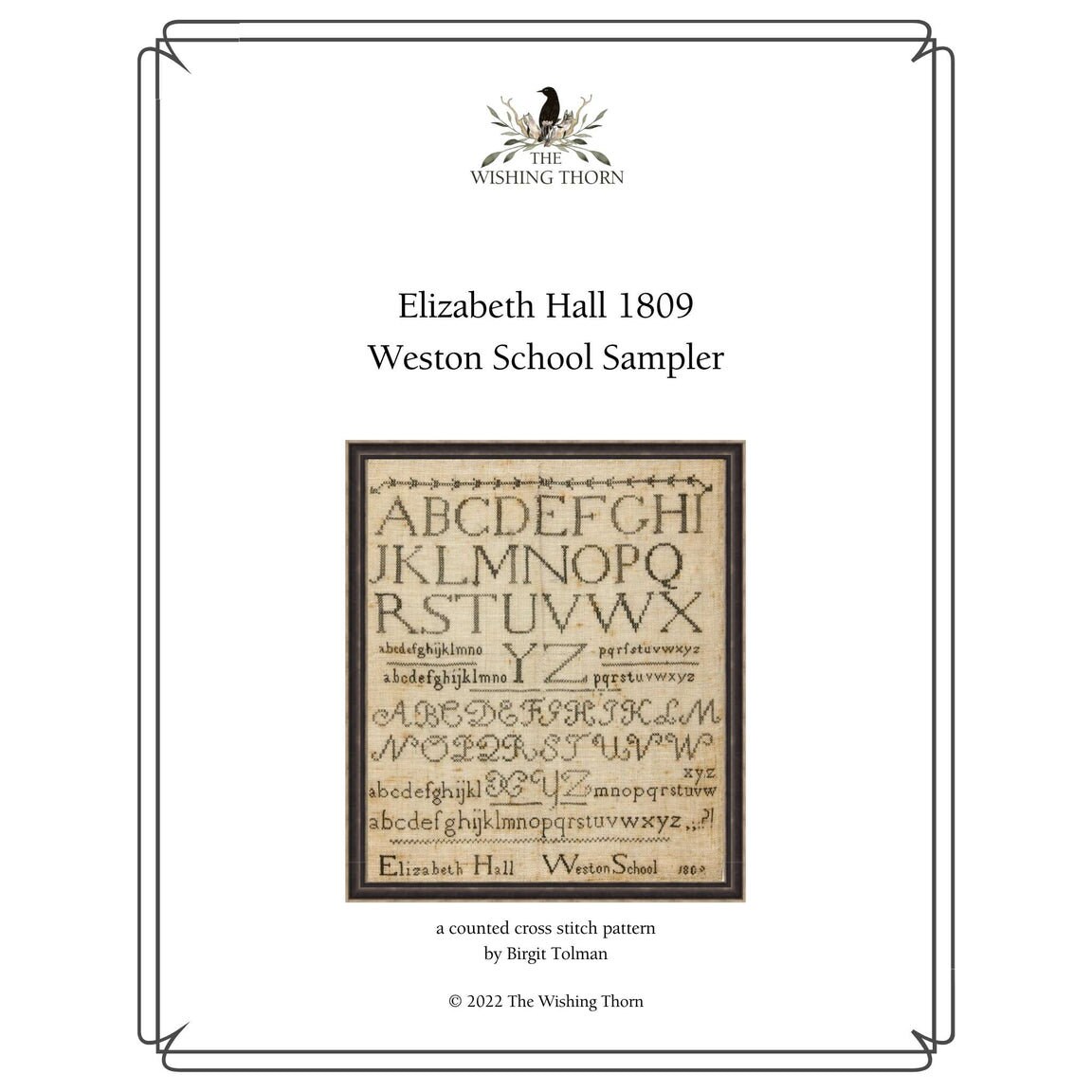 Counted Cross Stitch pattern, Elizabeth Hall 1809, Weston School Sampler. Designed by Birgit Tolman of The Wishing Thorn, this gorgeous Quaker Sampler is from the Westtown School in Pennsylvania. The School was founded in 1799 by the Religious Society of Friends, the Quakers. This makes Elizabeth's sampler one of the earlier pieces from the school. The school is still in operation today. Such elegance and simplicity. The layout of it is very pleasing to the eye as is the Roman-style alphabet that was favored by Quaker schools. The cut corner bellflower border is similar in style with that found on Ackworth School samplers.